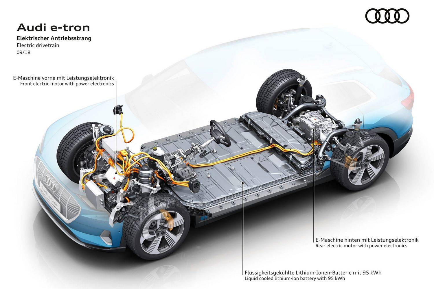 Аккумуляторный блок закрепляется на кузове Ауди Е-трон в 35 точках, что позволяет увеличить его крутильную жесткость на 27%, а также способствует повышению уровня безопасности автомобиля. Сравнивая Audi e-tron с обычными внедорожниками, можно говорить о его повышенной надежности как раз за счет увеличения крутильной жесткости.
