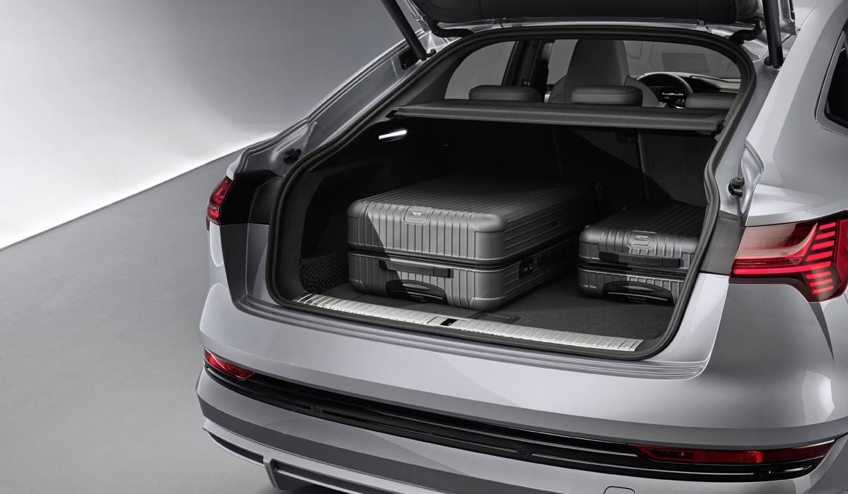 Пятиместный салон с тремя экранами на передней панели в целом такой же, как у базового е-трона, но потолок над задним рядом стал ниже на 20 мм. Объем багажника «под полкой» сокращен с 600 до 555 литров, а со сложенными задними сиденьями — с 1665 до 1595 литров. Сохранен оборудованный под капотом 60-литровый отсек, где можно хранить переносное зарядное устройство.