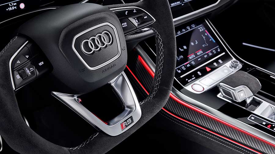 Интерьер Audi RS Q8 отличается от «гражданского» кросса за счёт спортивных кресел (за доплату можно получить мультиконтурные сидения с вентиляцией), усечённого рулевого колеса, RS-графики виртуальных приборов, а также соответствующих модификации декоративных деталей. У автомобиля цифровая «приборка», размер дисплея 12,3 дюйма, а мультимедийная система управляется с 10,1-дюймового тачскрина.