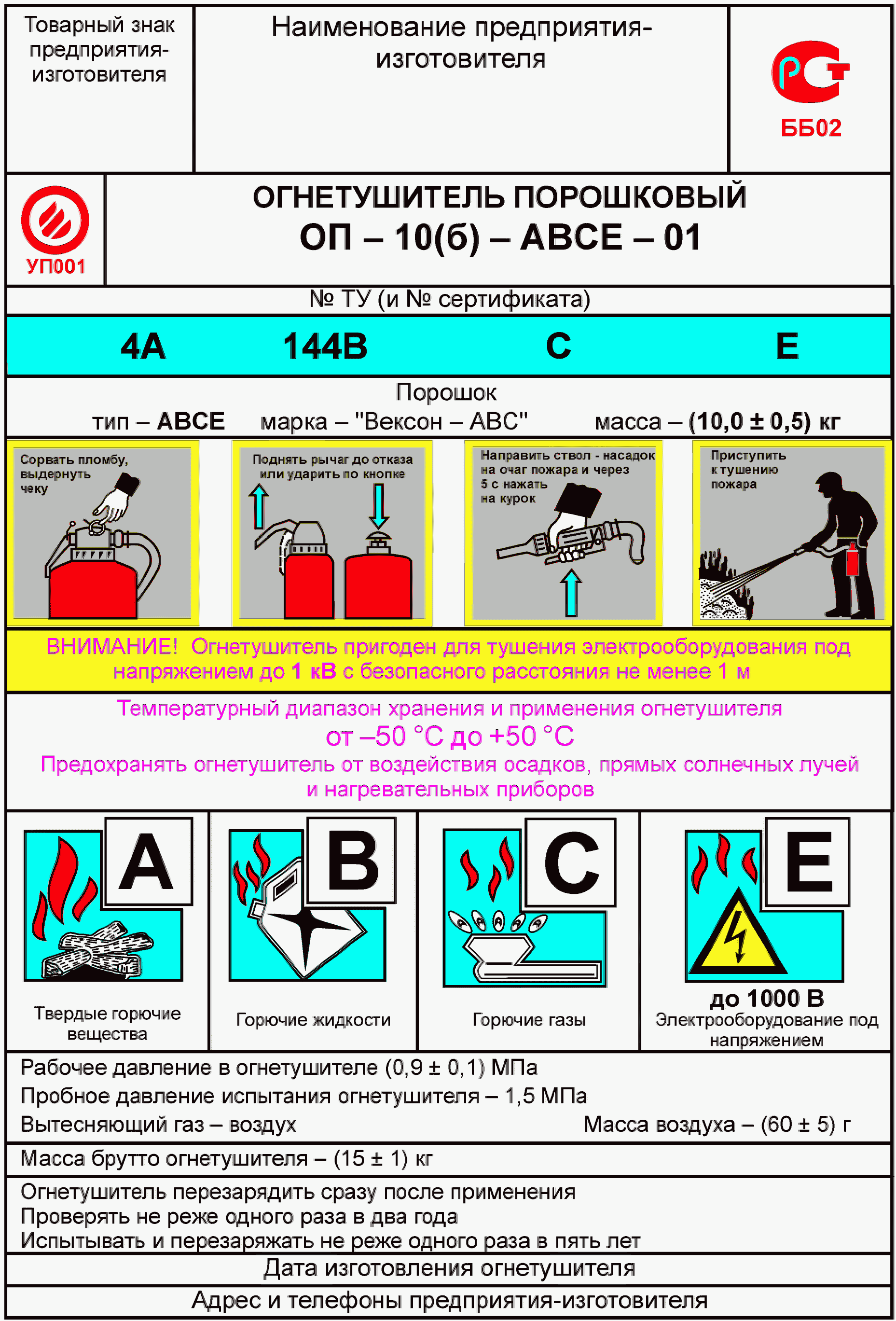 - классы пожаров, с которыми может справиться данный тип огнетушителя;