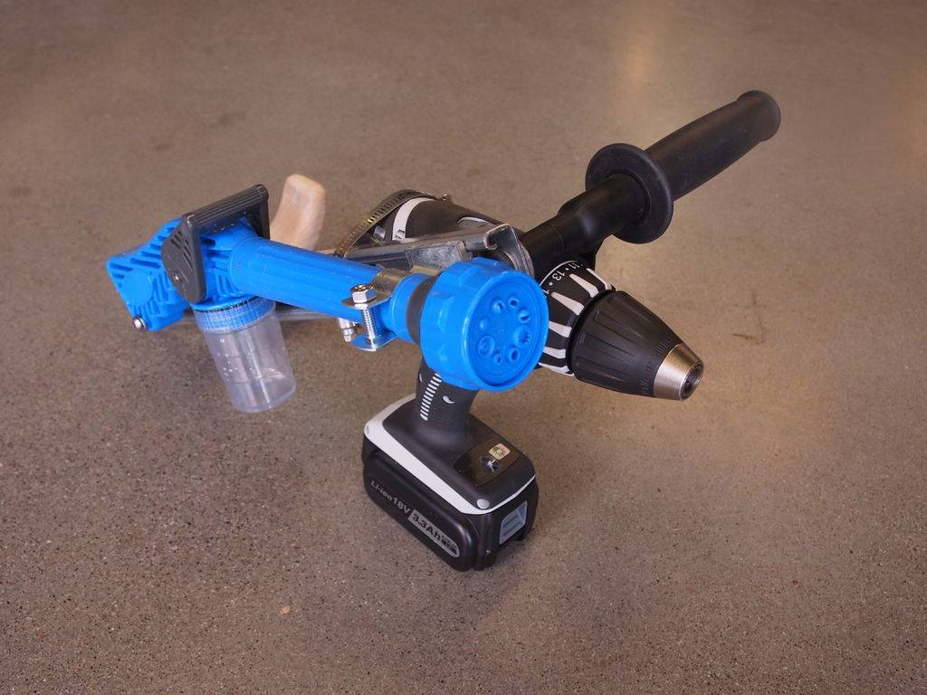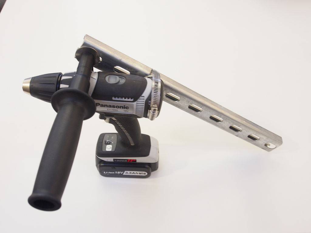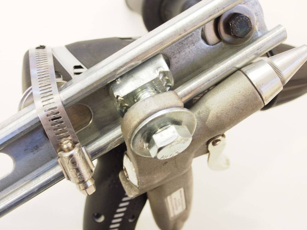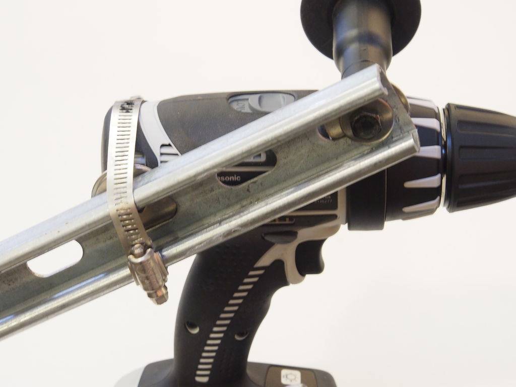 Установка скобы на сверло потребовала некоторых проб и ошибок. К счастью, у дрели, которую я использовал, была боковая рукоятка для дополнительного контроля с открытым отверстием для болта. Я смог просто разобрать ручку и собрать ее так, чтобы она захватила распорку. Для второй точки соединения я использовал хомуты, крепко удерживающие распорку на корпусе сверла.