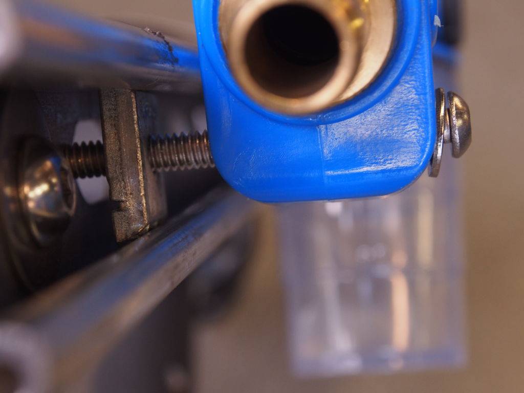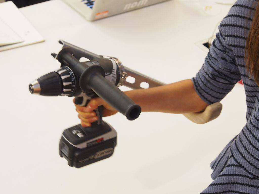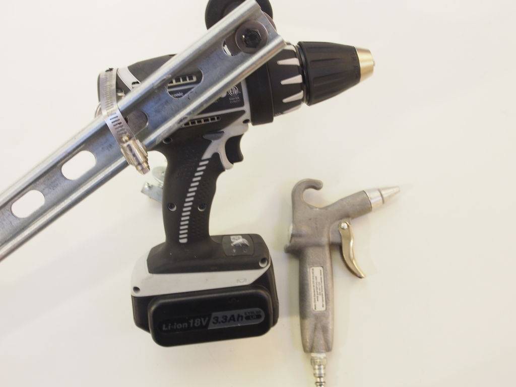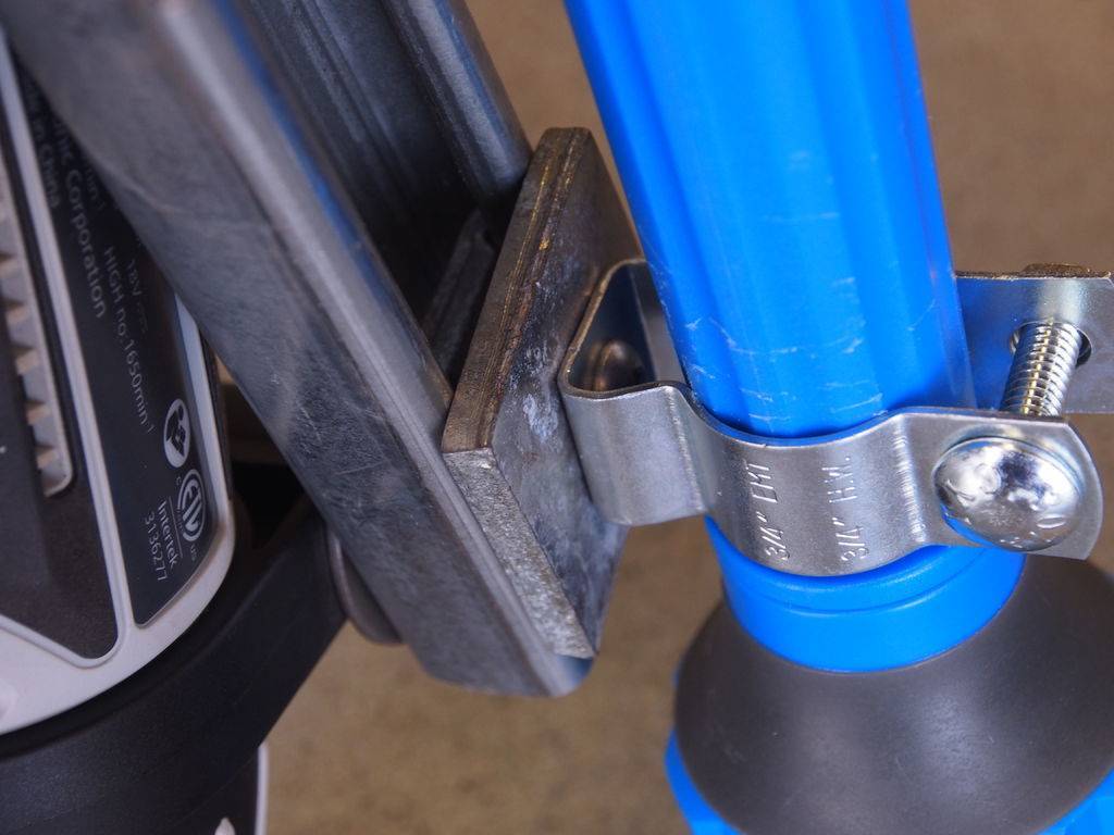 Установка скобы на сверло потребовала некоторых проб и ошибок. К счастью, у дрели, которую я использовал, была боковая рукоятка для дополнительного контроля с открытым отверстием для болта. Я смог просто разобрать ручку и собрать ее так, чтобы она захватила распорку. Для второй точки соединения я использовал хомуты, крепко удерживающие распорку на корпусе сверла.