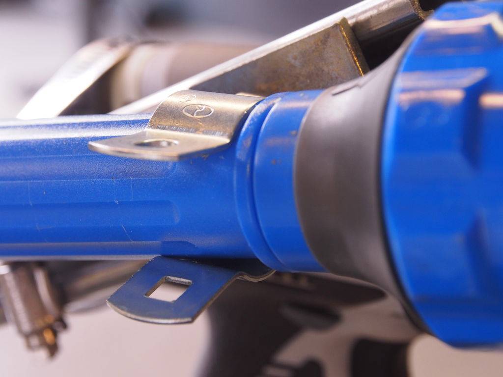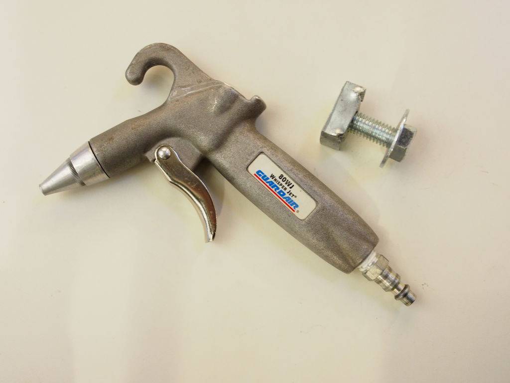 - Один конец оставшегося шланга закрепляем хомутом на выходе устройства, а к другому концу аналогичным способом присоединяем продувочный пневмопистолет.