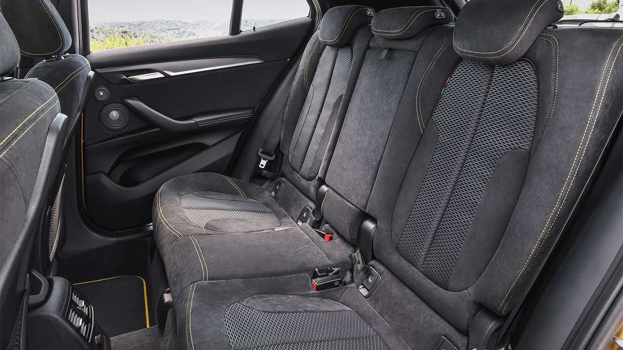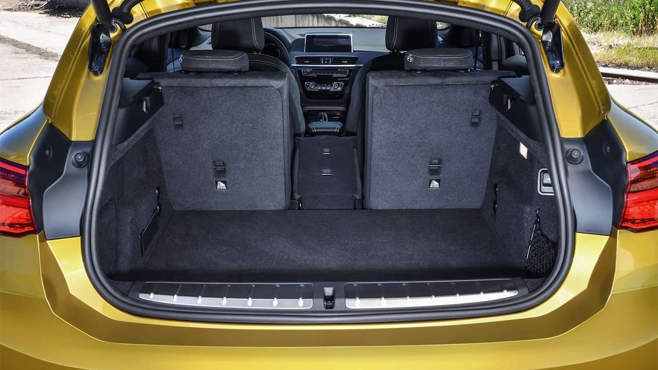 Задний ряд BMW X2 – 3-местный диван с откидным подлокотником. Свободного места там немного, для пассажиров предусмотрена розетка на 12V и освещение на потолке. Задний диван можно сложить для увеличения багажника, либо установить лючок для лыж с чехлом. Чехол платный, как и крепления под детские кресла.