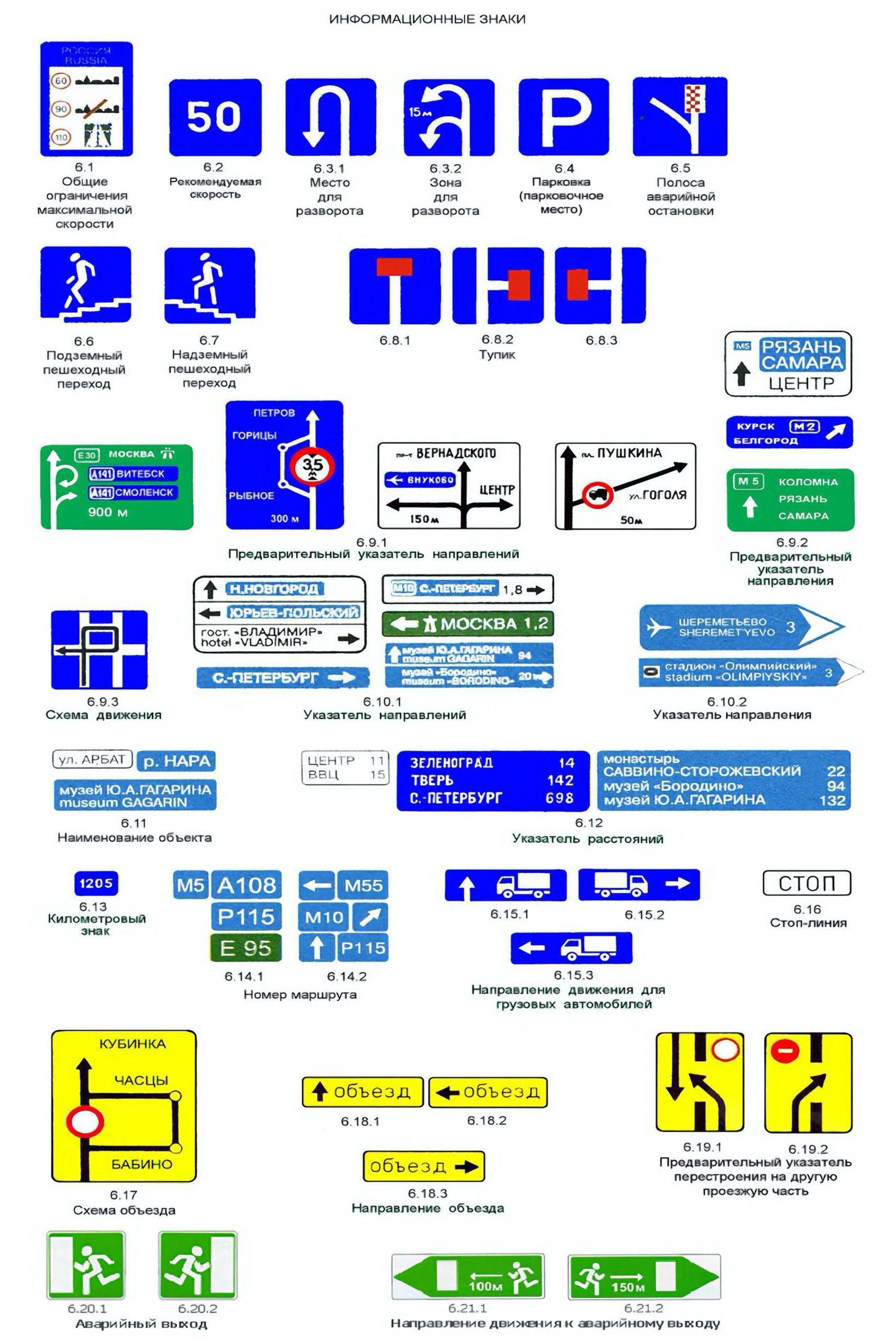 | Информационные | Указывают на места разворота или стоянки, информируют о направлении и расстоянии до населённых пунктов, о тупиках и полосах аварийной остановки, рекомендуют скоростной режим и указывают направление объезда. | Синий прямоугольник с белой картинкой внутри | “Разворот”, “Парковка”, “Стоп-линия”, Схема объезда”, “Тупик”. |