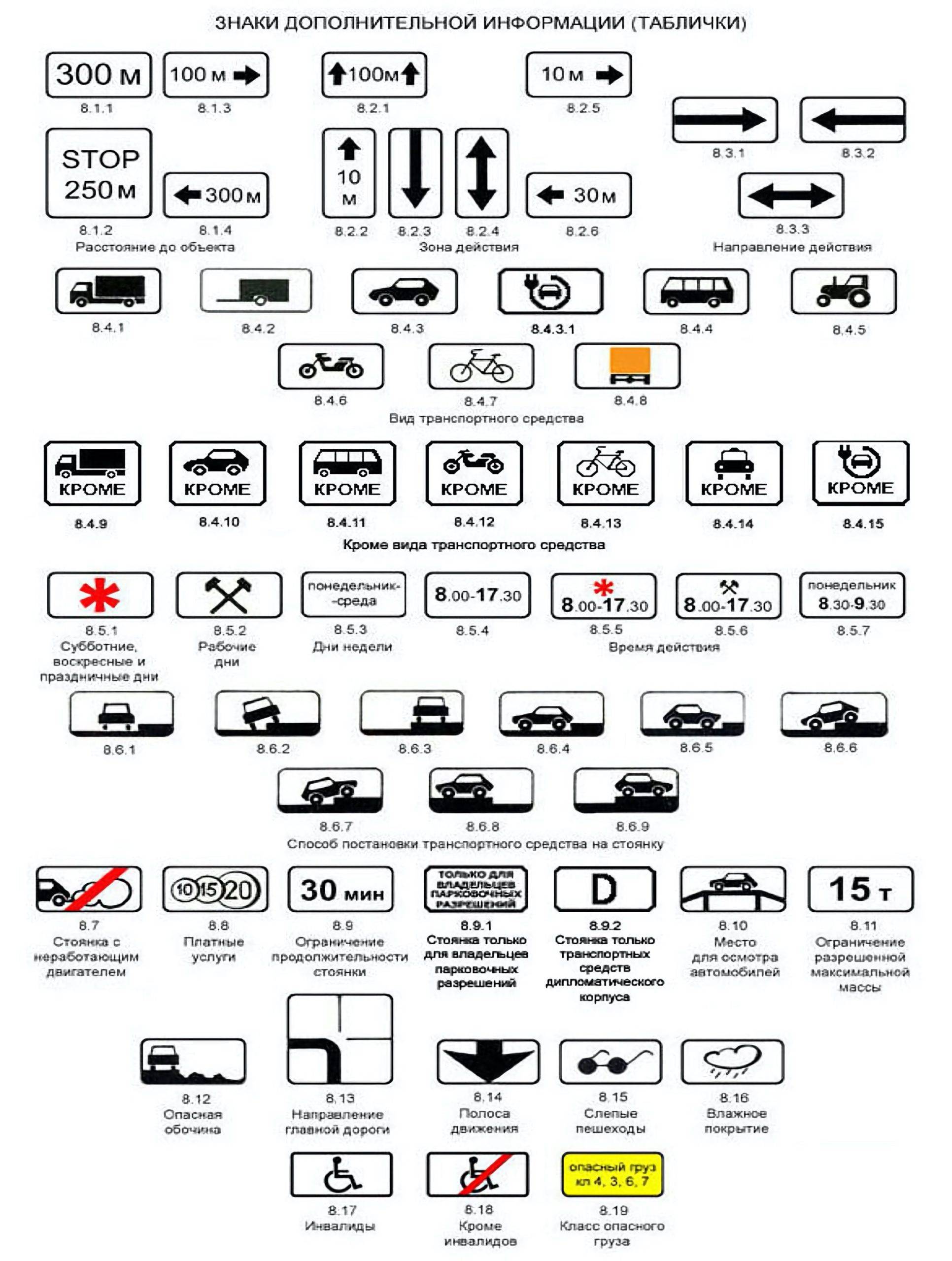 Используются вместе с основным знаком. Назначение табличек – ограничение действия либо уточнение основного дорожного знака. Также таблички могут содержать дополнительную информацию, важную для участников движения.