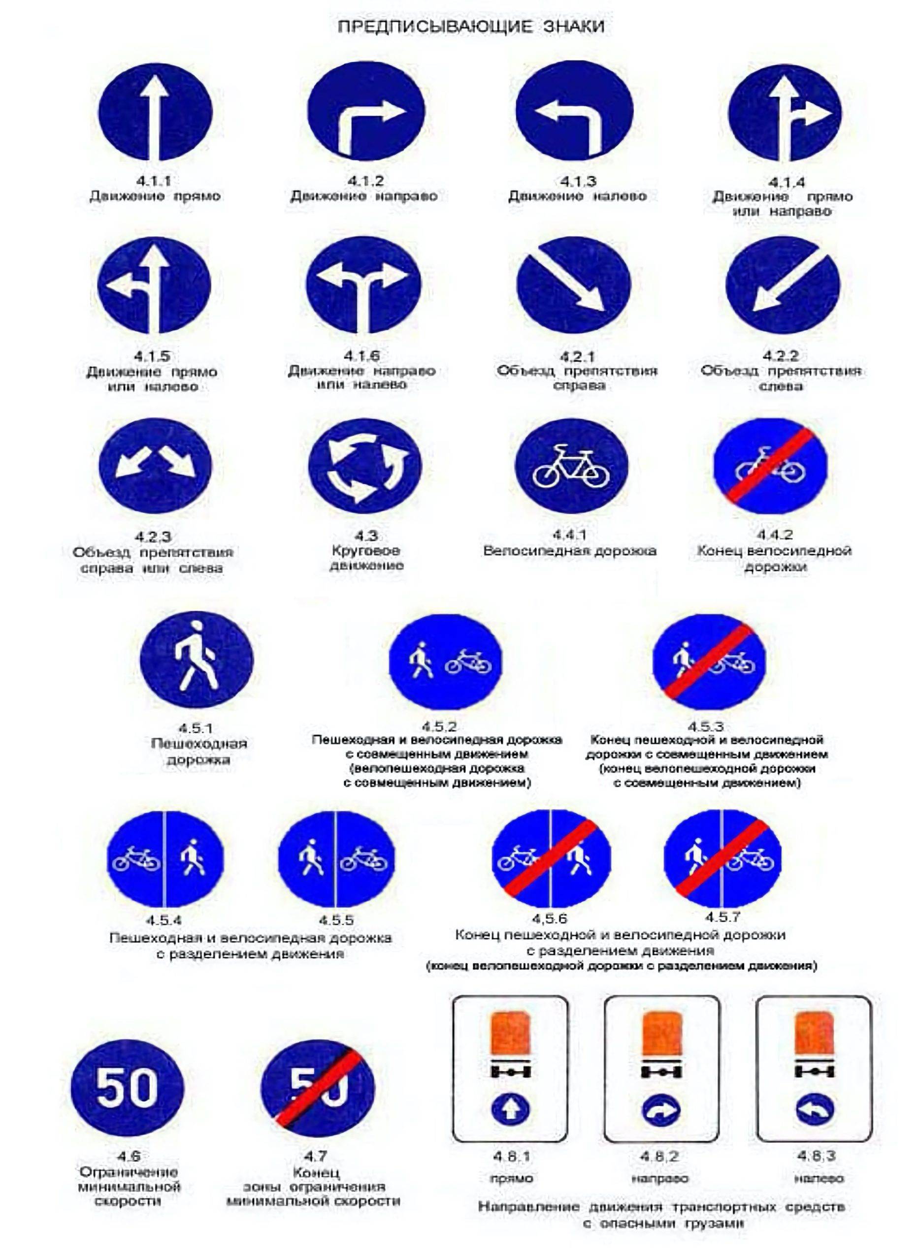 | Предписывающие | Предписывают направление движения, ограничивают минимальную скорость, указывают зоны движения для велосипедов и пешеходов. | Синий круг | “Движение прямо”, “Круговое движение”, “Объезд препятствия”, “Пешеходная дорожка”. |