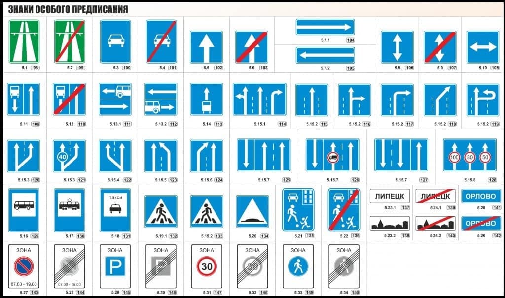 | Особых предписаний | Устанавливают направления движений по полосам, места остановок транспорта и пешеходных переходов, извещают о населённых пунктах, указывают на парковочные, жилые, пешеходные зоны и зоны с ограничениями скорости или остановки. | Синий прямоугольник с белой картинкой внутри | “Одностороннее движение”, “Реверс”, “Полоса для маршрутных ТС”, “Остановка”, “Пешеходный переход”, “Парковочная зона”. |