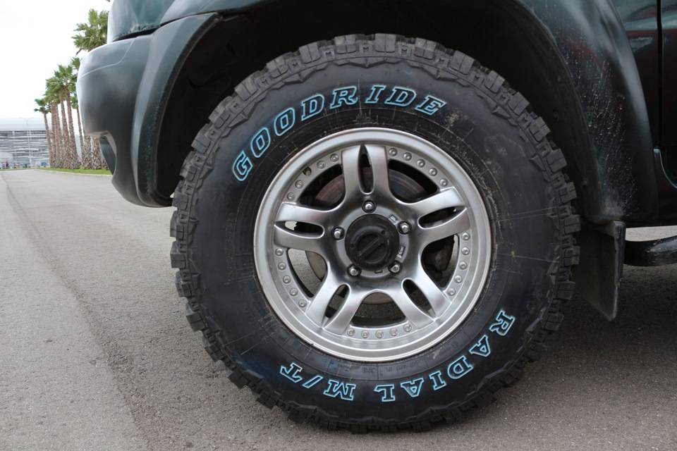 - Радиальная шина Goodyear Wrangler MT/R with Kevlar, оснащенная ненаправленным протектором грязевого типа. В конструкции шины используется кевларовый корд, защищающий боковины от порезов и проколов. Открытые кромки рисунка протектора обеспечивают повышенную проходимость при движении по рыхлым земляным грунтам или песку. Покрышка выдерживает температуру воздуха до +45…+50°С, отличается пониженным уровнем шума при движении по шоссейным дорогам или утрамбованным грунтовкам.