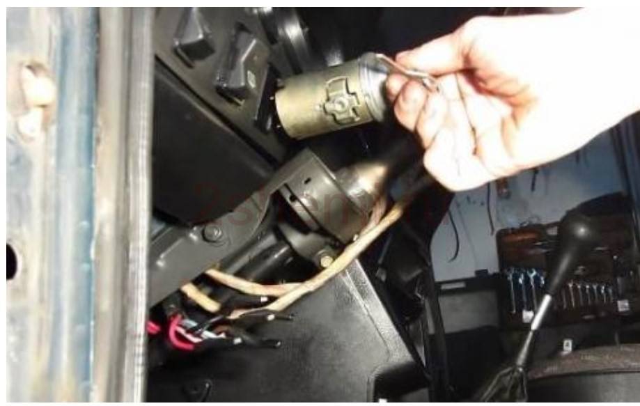 Он крепится в кронштейне рулевого вала двумя болтиками, после откручивания которых, ничего не происходит. Бесполезно пытаться вытащить замок из гнезда, если не знать о специальном стопоре. Он находится на корпусе замка под кронштейном. Этот стопор вдавливаем в замок тонкой отверткой через маленькое отверстие в кронштейне. Дальше, по всем инструкциям, замок должен свободно вытаскиваться, однако это не получается.