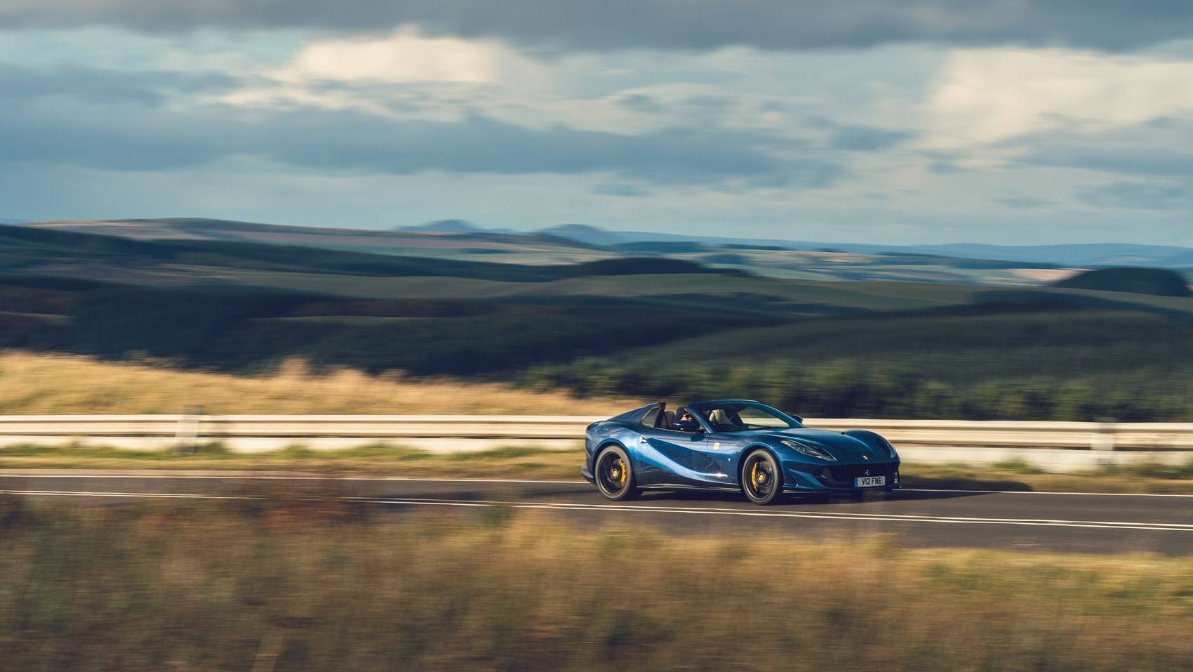 The driving position is pretty conventional and friendly enough to just jump in and go, the trim more racy-focused than GT-luxurious (and still with Ferrari’s older infotainment), and the interior just as spacious as the coupe, but my 6ft 1in would do better with a seat that went a little further back and dropped lower.