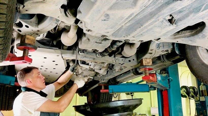- Установите автомобиль на яме, эстакаде или подъемнике.