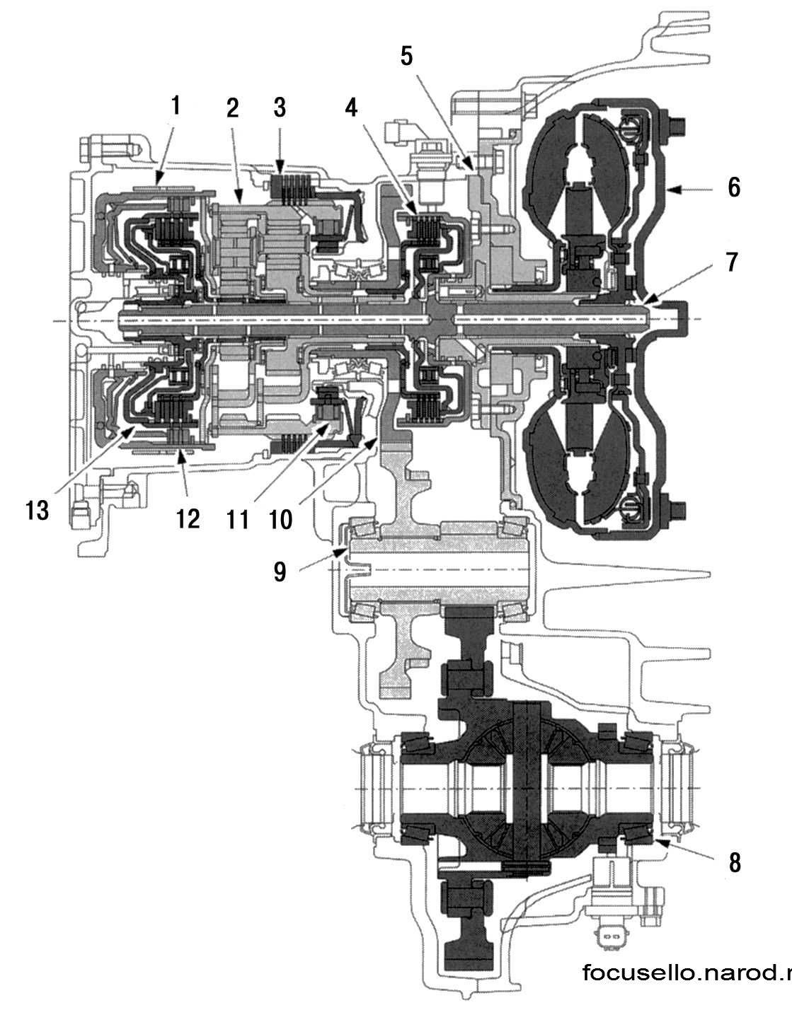 Автоматическая коробка передач: 1 — ленточный тормоз; 2 — планетарный механизм; 3, 4, 12 и 13 — многодисковые фрикционы; 5 — масляный насос; 6 — гидротрансформатор; 7 — входной вал; 8 — промежуточная шестерня; 9 — дифференциал; 10 — шестерня; 11 — муфта свободного хода