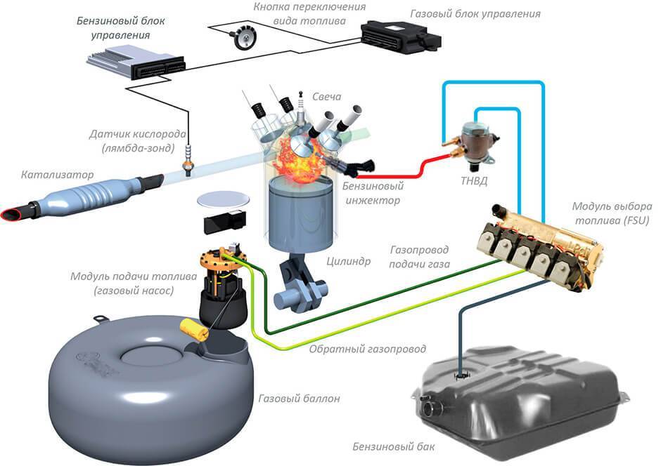 Система, которая позволяет транспортному средству двигаться на газе, называется ГБО. Такие установки могут работать на пропане (сжиженный переработанный газ) и метане (природный парообразный газ).