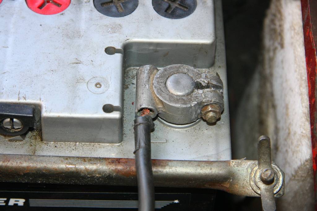 На креплении минуса аккумулятора с двигателем нужно проверить надёжность затяжки двух гаек, между которыми крепится контакт к двигателю: первым делом ослабляем наружную гайку и подтягиваем внутреннюю, а затем затягиваем и наружную.