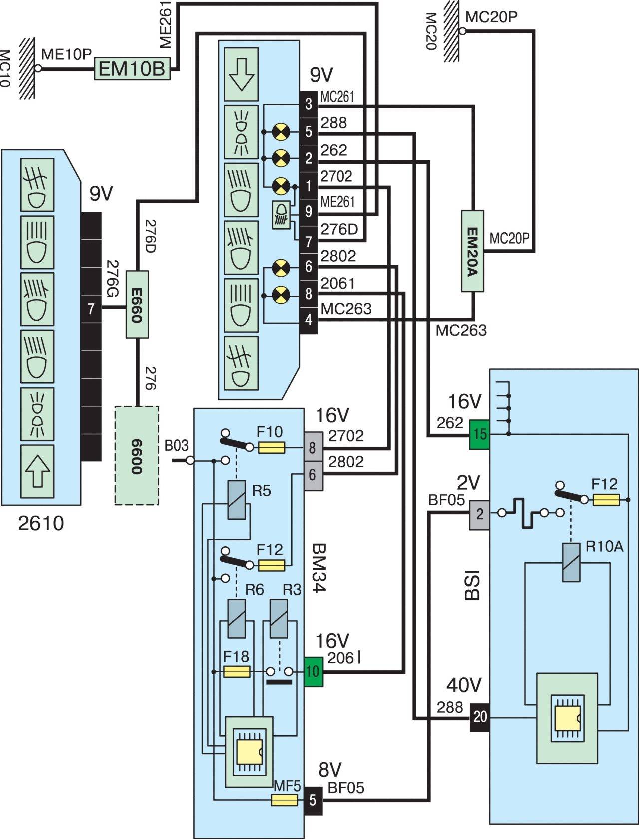 - F8 20 A Автомагнитола, радиотелефон, многофункциональный дисплей, сирена охранной сигнализации, электронный блок охранной сигнализации, коммутационный блок прицепа, модуль учебного автомобиля, питание блока подрулевых переключателей.