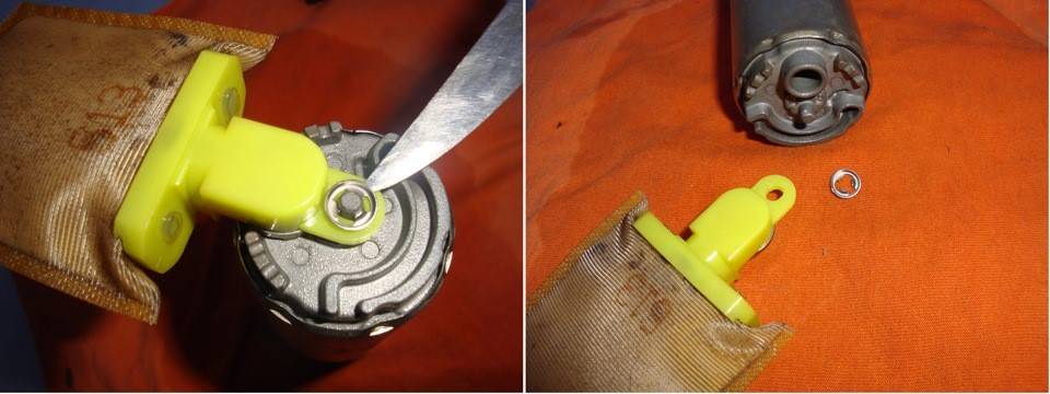 Снять крышку электробензонасоса. Для этого необходимо поддеть отверткой пластиковый фиксатор.