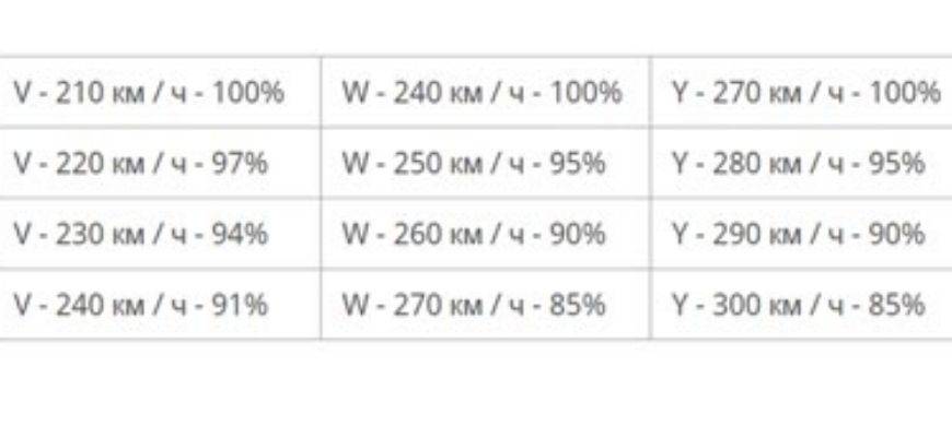 Так, если вы купили покрышки с максимально допустимой скоростью в 180 км/час, а ездить планируете со скоростью 210 км/час, то нагрузку нужно уменьшить на 9%.