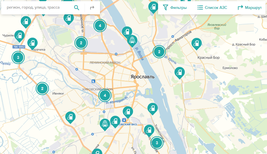 Самая подробная карта АЗС в России. Для большинства заправок указаны доступные виды топлива и цены. Предусмотрены фильтры: например, можно отобразить только те АЗС, для которых у водителя есть бонусная карта.