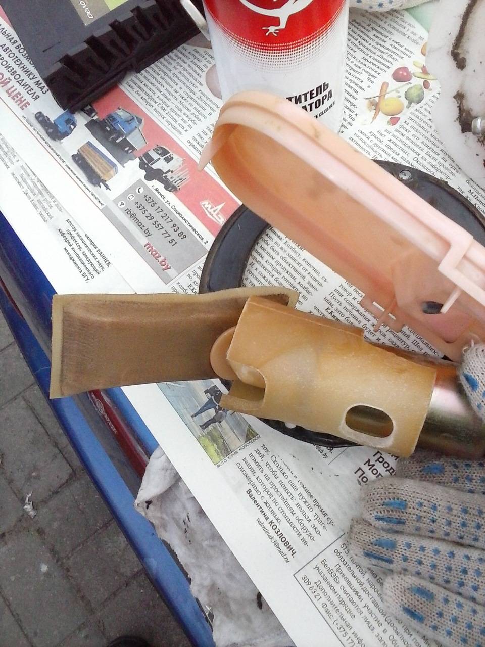 После того, как я извлёк бензонасос из недр бензобака, я сразу же заглянул с фонариком в бензобак — на дне чисто.Значит надо смотреть бензонасос. Было подозрение, что умирает сам насос.Разборка корпуса бензонасоса не очень сложная, отстегнул несколько пластиковых зацепов и корпус разобрался на 2 части (естественно снял предварительно поплавок).Вытащил сам насос из корпуса и обнаружил, что в нижней части корпуса (корпус не разборный) есть сетка, которая фильтрует поступающий в насос из бака бензин, она вся чёрная, как будто в отработанном масле.Как мне позже объяснили — чёрная маслянистая фракция — это ил, который образуется в верхней части танков при хранении бензина, ведь там образуется конденсат + жара — оттуда и жизнь ))).В итоге, поняв, что сетку никак не вынуть, чтобы промыть, я прибегнул к военной хитрости, попросил друзей (ведь машина стояла на улице вся разобранная и с дырой в бензобак диаметром 100 мм примерно, я не решился её закрыть и уйти от неё, а стоял и проветривал её всё это время) доехать до ближайшей автомойки и попросить мойщиков промыть сетку пеной для мытья кузова и всё там прополоскать потом обильно водой из под крана.Через 10-15 минут привезли чистый, как новый, корпус насоса и я приступил к обратной сборке.Всё собрал и машина поехала после этой операции как и прежде.