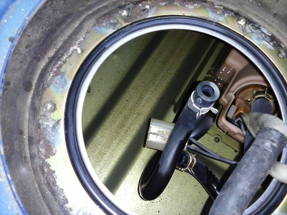 Далее следует применить некоторую сноровку, чтобы извлечь бензонасос в сборе с корпусом из дыры, т.к. поплавок уровня топлива торчит от корпуса в сторону, а отверстие круглое по диаметру насоса.