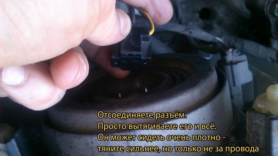 - Далее нужно отсоединить колодку от фары, для этого надо потянуть ее за корпус. Так как он сидит обычно довольно плотно, следует тянуть с силой. При этом нельзя держаться за провода машины, так как их можно вырвать из разъема.