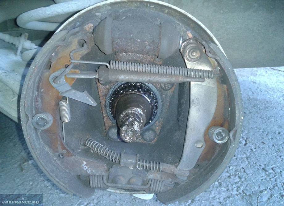 Но и не стоит забывать какую-нибудь инструкцию по типу этой Советую сразу купить новые шплинты, которые держат гайку — я брал от ВАЗ-2101 по 5 рублей за штуку. Добравшись до гайки, вспомнив слова продавца из магазина, уже был готов приложись на вороток всю свою силу, но, не успел — гайка без напрягу открутилась)))) Достав шайбу и подшипник, в попытках снять барабан, был поставлен в ступор: он не снимался. Начал стучать по нему молотком через деревяшку — ничего. Постучал по нему молотком с обратной стороны — верх отошёл, низ нет. В порыве мыслительных процессов жопе пришла гениальная идея: наживить колесо и подёргнать))) Прикручиваем на 2 болта и трясём так, чтоб в столице нашей Родины это чувствовалось. НО! Не увлекаемся дабы машина с домкрата не рухнула)))) Сняв барабан — предстала передо мною такая картина (которая мне очень пригодилась в дальнейшем)