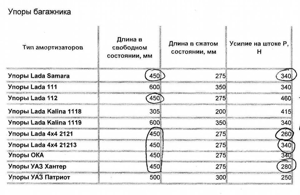 Итак начнем с того, что упоров газовых множество, нам нужен самый слабый. В интернете находим характеристики(табл на фото 1). Я нашел в магазине от Нивы 2121 — с усилием 260. Попробовал от 2112(460 Н) — чуть не оторвал крышку.