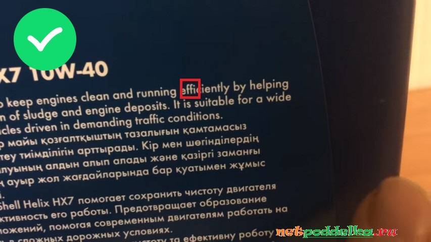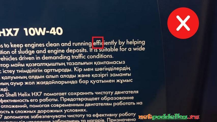 Производитель наделил некоторые участки лицевой этикетки своего изделия отражающими свойствами. Это область поверх названия масла, а также изображение поршня двигателя. Если к ним приблизиться на достаточное расстояние, то запросто можно разглядеть пальцы рук, предметы одежды, лицо. На поддельных образцах те же участки этикеток будут показывать лишь некоторые тени. Они просто слегка поблескивают, но ничего толком не отражают.