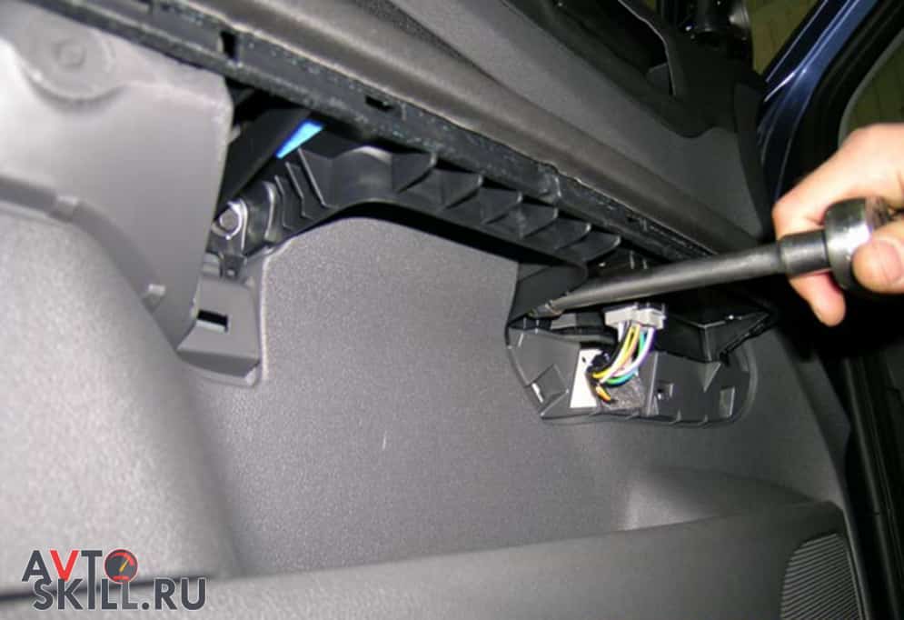 Делается это при помощи той самой головки на «8». Ней необходимо просто открутить два болта, на которых и крепится слой обшивки, после чего просто отсоединить все разъемы.