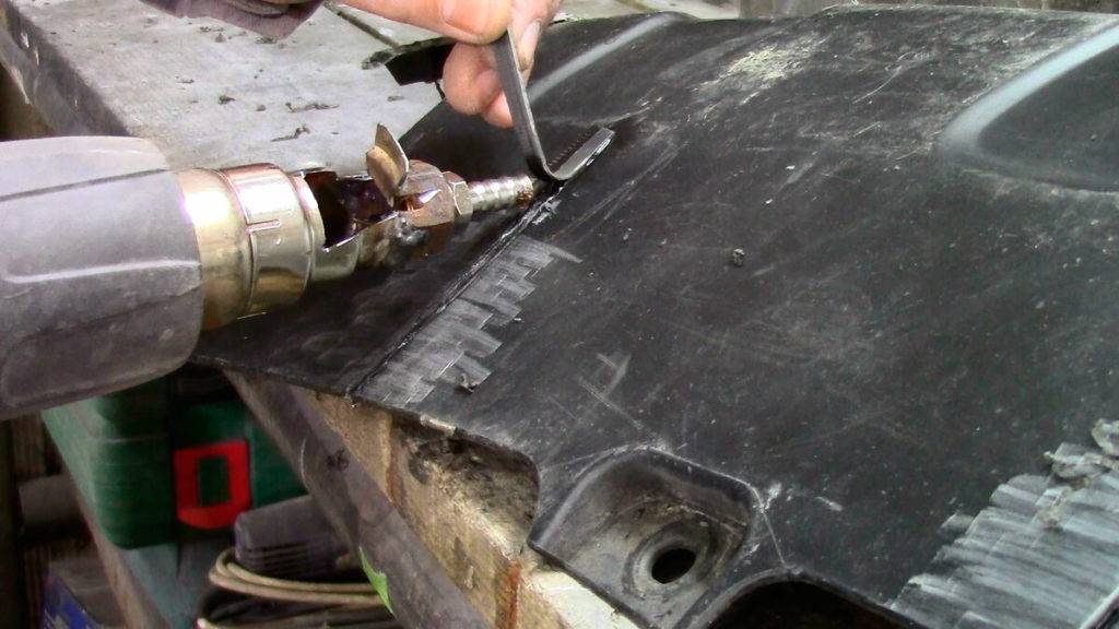 В ином случае, шанс восстановить деталь есть. Для ремонта бампера используют специальный фен и полоски, нарезанные из ABS пластика. Фен расплавляет пластиковую полосу и тем самым склеивает две части поврежденной детали.