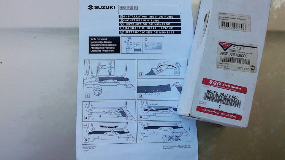 Покрасили качественно, в цвет, с учетом того, что деталь пластиковая, попали неплохо. Устанавливал сам. В принципе ничего сложного, но при снятии сорвал все четыре (все четыре, Карл!) нижних болта крепления. Конструкция, конечно так себе, к усилителю приварены четыре кронштейна, а к ним, в свою очередь, четыре закладных гайки, в которые вкручиваются болты М6, проходящие через бампер. Сколько я не пытался раскачать — результат во всех случаях один — срыв головки болта. Временно сделал крепления с помощью пластиковых стяжек, в ближайшее время буду высверливать заломыши и восстанавливать резьбу. Оригинальны болты уже заказал. Еще из неприятного — свернул шпильку на одном из отражателей. Так же заказал пару новых, буду менять.Заранее была куплена оригинальная защитная наклейка, полезный, на мой взгляд, аксессуар: