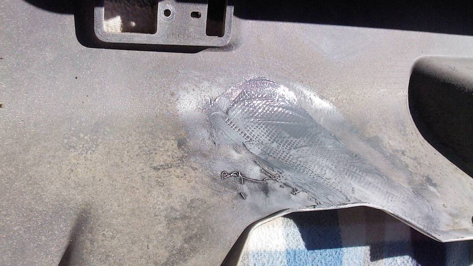 Конечно, можно сделать всё, но результат такого ремонта будет спорным, велик шанс, что он опять треснет, да и геометрию восстановить “в ноль” практически нереально, всё равно он будет горбатым. Новый оригинальный бампер на 3D стоит более 20 т.р., не оригинальных не существует в принципе. Принял решение искать б/у. В результате длительного мониторинга, удалось найти на Avito приемлемый по состоянию бампер, всего с одной трещиной в районе выхлопной трубы. Мало того, что он стоил всего 1000 р., он оказался того же цвета. Перекрашивать правда всё равно пришлось — кроме трещины были заметные сколы и царапины. Позабавило, что дата выпуска абсолютно такая же, что и на “родном” бампере: