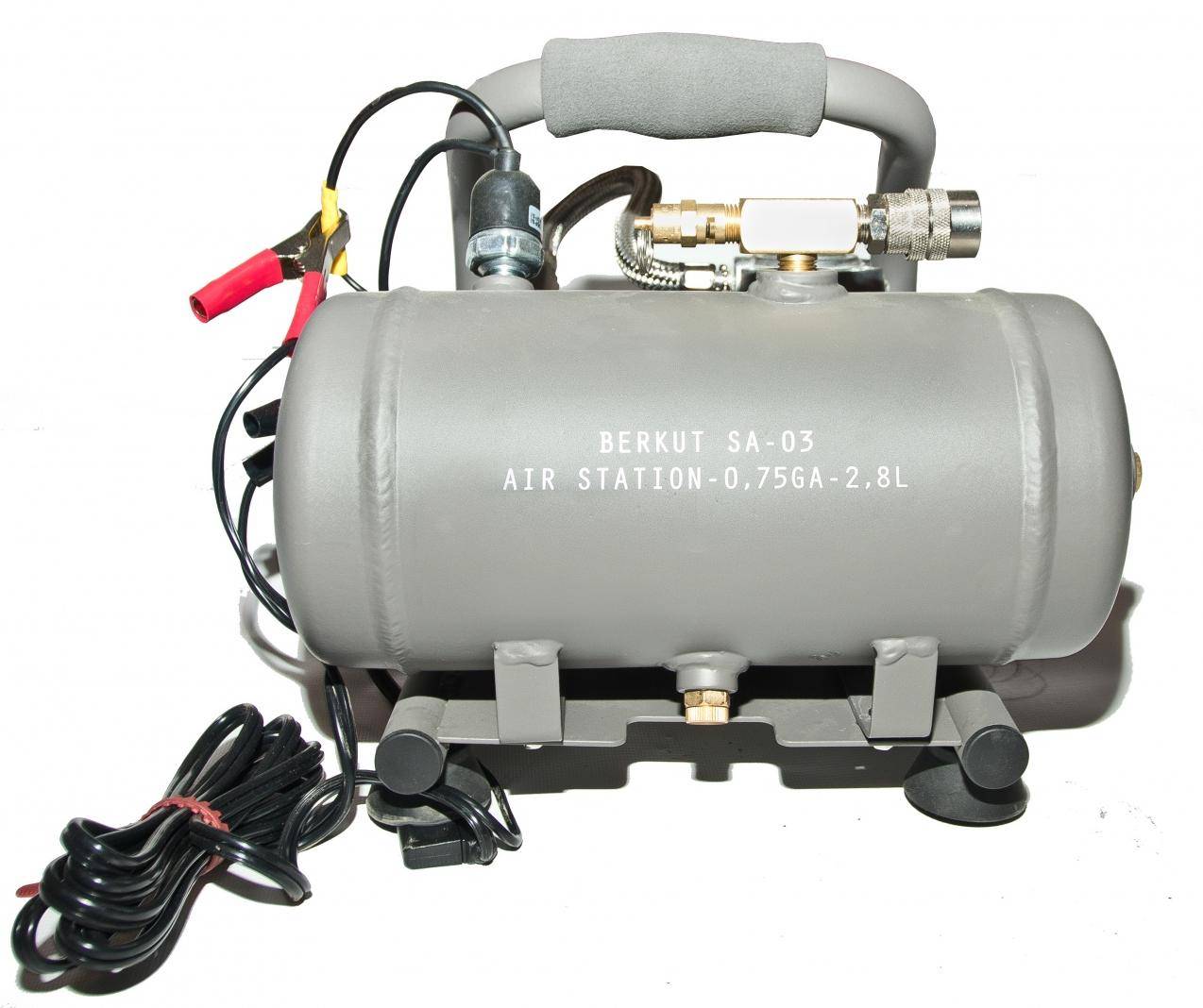 Последняя модель SA-03 — это полноценная пневматическая мини-станция с рамой и четырьмя опорными площадками-виброгасителями. Подключается крокодилами к аккумулятору.