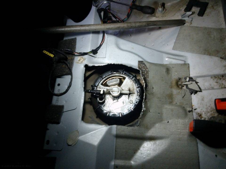 Этот способ предполагает замену насоса без снятия бака с автомобиля, но для этого необходимо прорезать с помощью ножниц по металлу люк в днище под задним пассажирским сиденьем. Работы нужно проводить либо на открытом воздухе, либо в хорошо проветриваемом помещении, чтобы избежать скопления бензиновых паров. Люк вырезаем, ориентируясь на жгут проводов, пропущенный в днище под напольным покрытием.