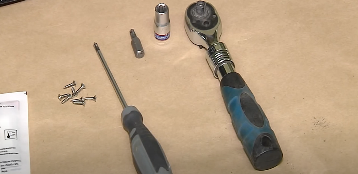 - Ключ с трещоткой небольшого размера, головка на 7 и звездочка TORX-20. Также потребуется крестообразная отвертка под винты 2,5 х 10, которых понадобится 10 штук на каждую накладку.