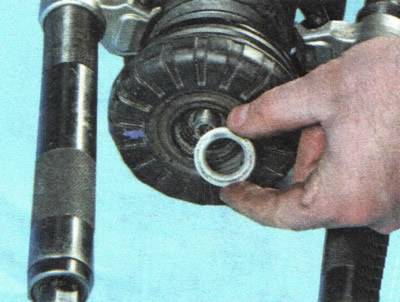 снимаем металлическую проставку зажимающую опорный подшипник.