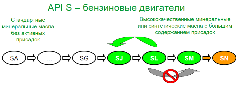 Жидкость более высокого класса использовать можно, а более низкий выбирать не стоит. Масла каждого последующего класса по возрастающей, как правило, производятся со всеми необходимыми присадками для предыдущей категории. Если ранее в системе было залито масло SЕ, то вместо него подойдут продукты с маркировкой SF или SG. А вот SJ и прочие жидкости для современных машин сразу брать не рекомендуется. Можно попробовать применить SM, если мотор не очень старый.