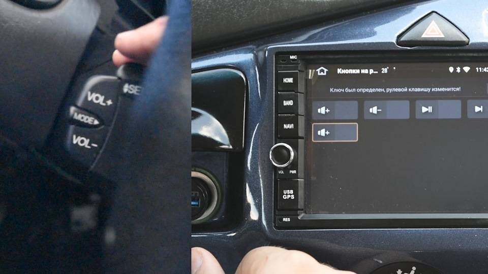 Остаются свободными у нас:1. провод движения, который должен как-то подключаться к датчику скорости, чтобы нельзя было посмотреть видео во время движения (таковы американские требования к безопасности), но мы же люди не тупые))) и мы так не делаем, поэтому просто прикручиваем его к корпусу и все будет ОК!)))2. провода камеры: тюльпанчик — к тюльпанчику, сигнальный (тёмно фиолетовый возбуждающий провод) — к сигнальному проводу заднего хода, который мы нашли ранее.3. три коричневых провода с пометкой key1, key2 и GND: key1 и key2 — к двум проводам подрулевого джойстика на которых нет вольтажа, а GND: к третьему (скорее черному) проводу джойстика, на котором будет от 6 до 15 вольт.Ну и далее пробно включаем и настраиваем наши кнопочки)))