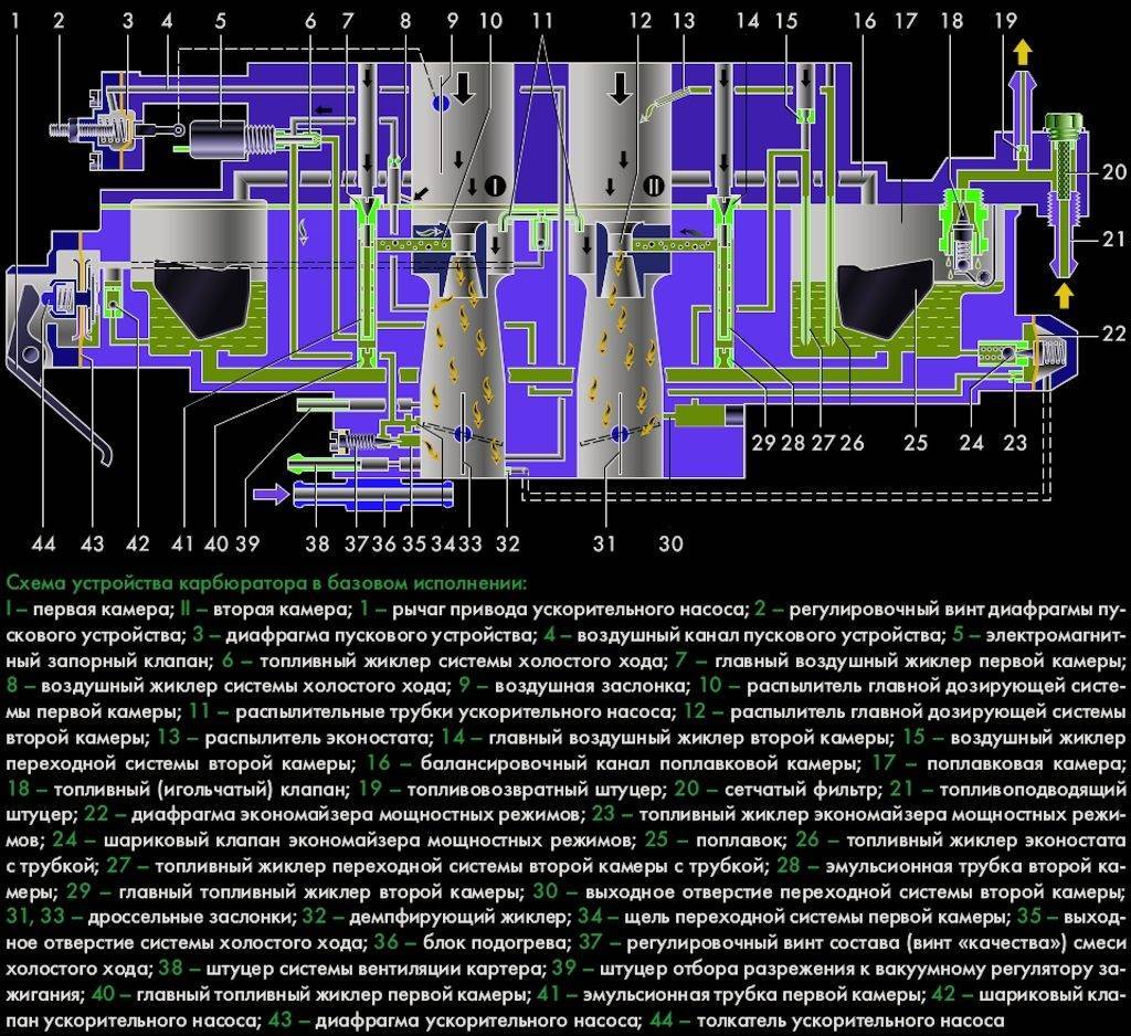 На фото представлен общий вид карбюратора с указанием основных узлов.