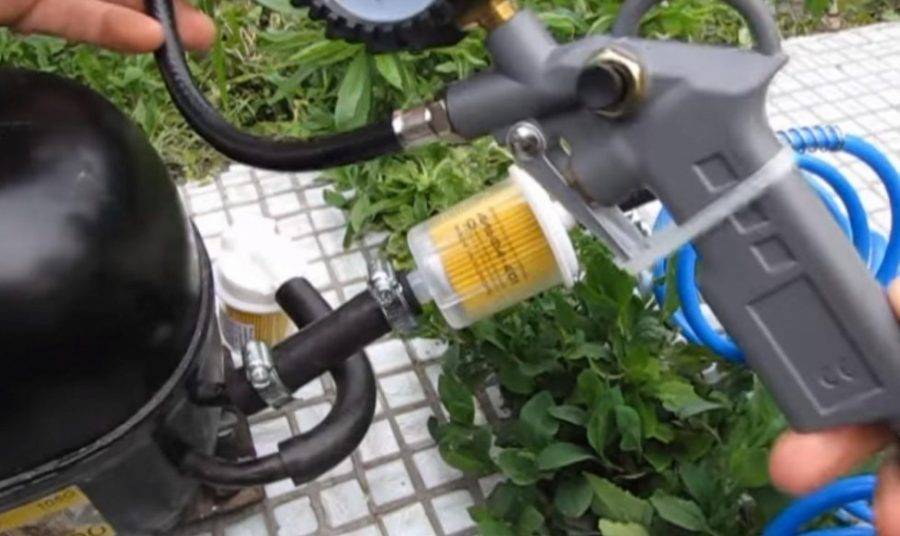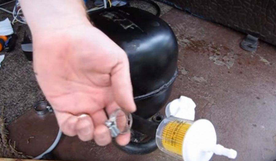 Теперь нужно подобрать кислородный шланг, ориентируясь по диаметру выходной трубки (патрубка), устанавливаем воздушный фильтр на входе в компрессор. Один из патрубков предназначенный для забора воздуха можно просто обрезать ножом, оставив отверстие свободным. Вовремя соединения элементов хомуты использовать необязательно. Ведь эта часть установки работает свободно и не подвержена мощным нагрузками от давления. Главное чтобы все элементы сидели плотно и не прокручивались
