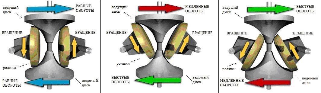 В отличие клиноременной конструкции, вариатор тороидального типа состоит из двух дисков, выполненных в виде вогнутых криволинейных поверхностей. Вращение от ведущего элемента на ведомый передается при помощи специального ролика скользящего действия. При его наклоне и перемещении к наружному диаметру ведомого диска происходит увеличение передаточного числа. Соответственно, при наклоне ролика в противоположную сторону и смещении к центру диска, передаточное отношение вариатора снижается.