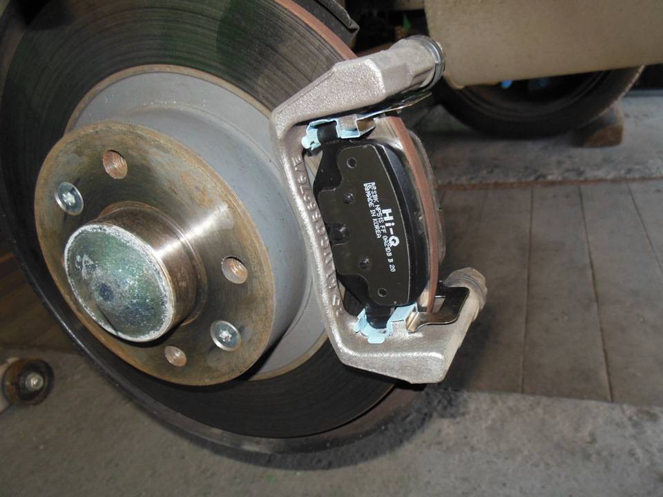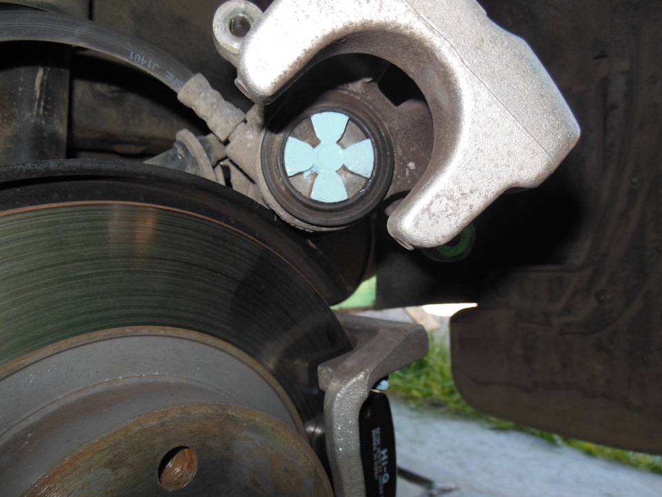 Перед установкой колеса смазывал ступицу медной смазкой. В той же последовательности меняем колодки и на втором переднем колесе.С передом закончили, переходим к замене задних колодок. Перед заменой снимаем автомобиль с ручного тормоза. Аналогично замене передних колодок снимаем суппорт, все очищаем, смазываем, ставим новые колодки.
