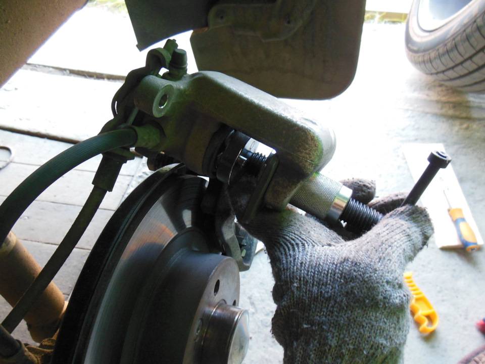 А вот просто так задавить тормозной поршень не получится, его нужно задавливать вкручивая. Для этого у меня уже имелось приспособление для утапливания поршней тормозного цилиндра VAG Дело техники (арт. 820 005), только пришлось немного подточить выступающие зацепы.