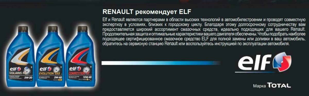 Производитель рекомендует использовать материалы, выпущенные нефтяной компанией Elf (структурным подразделением концерна Total), которая является партнером Renault с 1968 г.