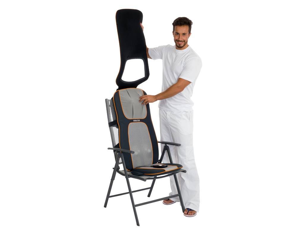 Сшита накидка из прочных материалов. Она устанавливается как на сиденье, так и на спинку кресла. Так что вам не придется менять ее положение для массажа разных групп мышц. А особая форма роликов, установленных в этой накидке и различные виды их движения, позволяют проводить эффективный расслабляющий массаж.