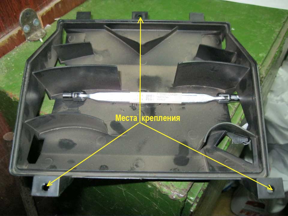 Теперь собранный вентилятор внедряется обратно в то пространство, в котором ранее «обитал» его старый аналог. Всё надёжно закрепляется и проверяется закрытие и открытие капота. В отдельных случаях после внедрения «инородного» вентилятора не удаётся нормально закрывать капот.
