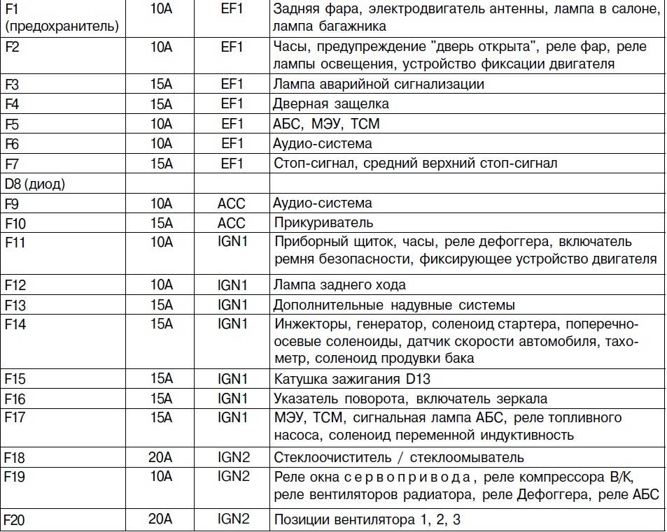 ПРЕДОХРАНИТЕЛИ МОНТАЖНОГО БЛОКА В ОТСЕКЕ МОТОРНОМ Обозначение предохранителя / (номинальный ток, А) / элементы Защищаемые EF1 (80) Цепи предохранителей EF15 – EF2 и F1 – F7 EF20 (30) Выключатель зажигания (цепи питания приборов комбинации и топливного насоса) EF3 (30) Выключатель стартер (зажигания, вентилятор отопителя, электростеклоподъемники) EF4 (30) основного Электродвигатели и дополнительного вентиляторов EF5 (30) Электродвигатели EF6 стеклоподъемников (50) Не используется EF7 (30) Элемент обогрева стекла заднего EF8 (30) Электродвигатель вентилятора отопителя (4-я диод) D9 (скорость) Электромагнитная муфта компрессора кондиционера Лампы (20) EF10 блок-фар (дальний свет) Лампа (10) EF11 левой блок-фары (ближний мотор), свет-редуктор регулятора направления пучка левой света блок-фары EF12 (10) Лампа блок правой-фары (ближний свет), мотор-регулятора редуктор направления пучка света правой фары-блок EF13 (10) Лампа сигнала торможения/света габаритного в левом заднем фонаре (габаритный подсветка), свет комбинации приборов, мелодичный сигнал, габаритного лампа света в левой блок-фаре, регулятора переключатель направления пучков света фар, лампы выключатель противотуманного света в заднем фонаре, выключатель, часы аварийной сигнализации, подсветка пепельницы, выключатель, аудиосистема кондиционера