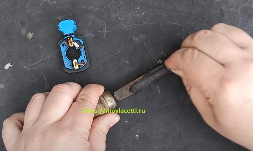 В общем, берем новую щетку и приступаем подгонять ее напильником. Делается это довольно быстро. Главное не переусердствовать и не сточить больше необходимого