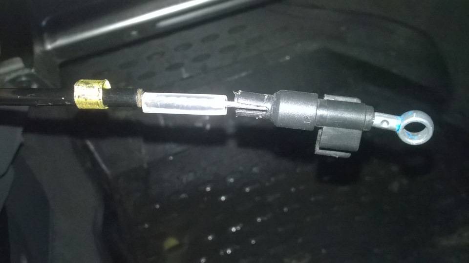 3. Отсоединяем медную обжимную пластину с пластикового кожуха троса, на стержне от ручки делаем разрез и вставляем его между этой обжимной пластиной и кожухом давя на стержень. Размер стержня должен соответствовать тому расстоянию, на которое заслонка не доходит до конца (у кого-то 5-8 мм, у кого-то 1,0-1,5 см).